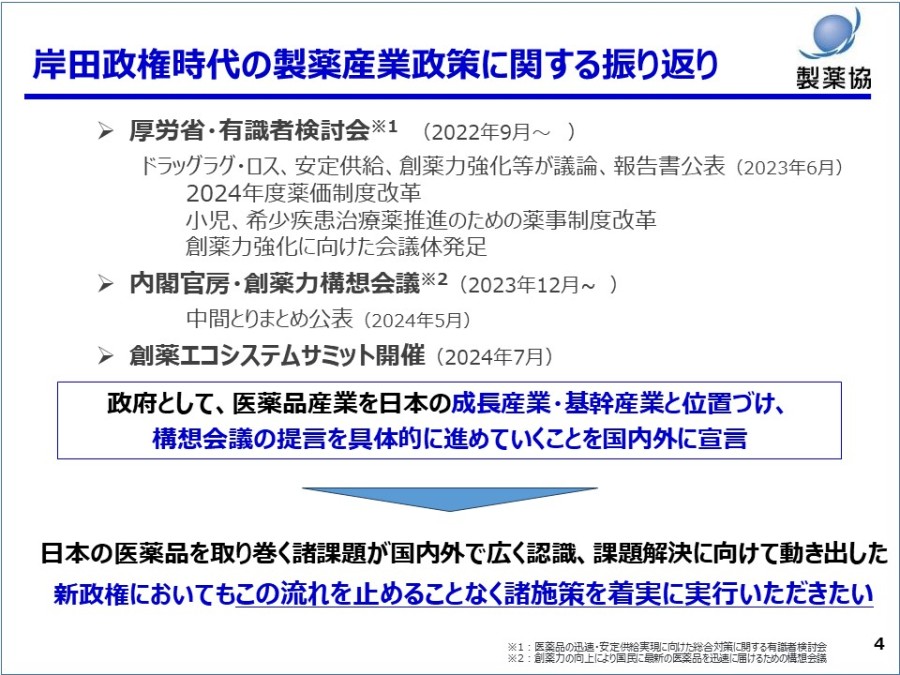 岸田前政権が発足した2021年当時から、製薬産業においては、新型コロナウイルス感染症(COVID-19)パンデミックにおける日本発ワクチン・治療薬の開発の遅れ、ドラッグ・ラグ/ロスの問題、必須医薬品の安定供給の問題などが顕在化していました。これらの諸課題の解決に向け、2022年9月に厚労省に「医薬品の迅速・安定供給実現に向けた総合対策に関する有識者検討会」が設置され議論が重ねられてきました。その結果である報告書(2023年6月公表)に基づき、日本での開発を促進するための2024年度の薬価制度改革や薬事制度の見直し等が進められました。また、2023年12月からの創薬力構想会議においては日本の創薬力向上について議論され、それを踏まえて7月の創薬エコシステムサミットでは当時の岸田文雄首相自らご講演され「医薬品産業を日本の成長産業・基幹産業に位置付ける」と宣言されました。