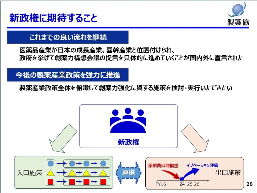 従いまして、新政権においては、製薬産業政策を考えるうえで、この繋がりの重要さを十分に認識して各政策を立案、実行に移していただく事を訴えていきたいと思い、本日はその内容についてお話ししたいと思います。