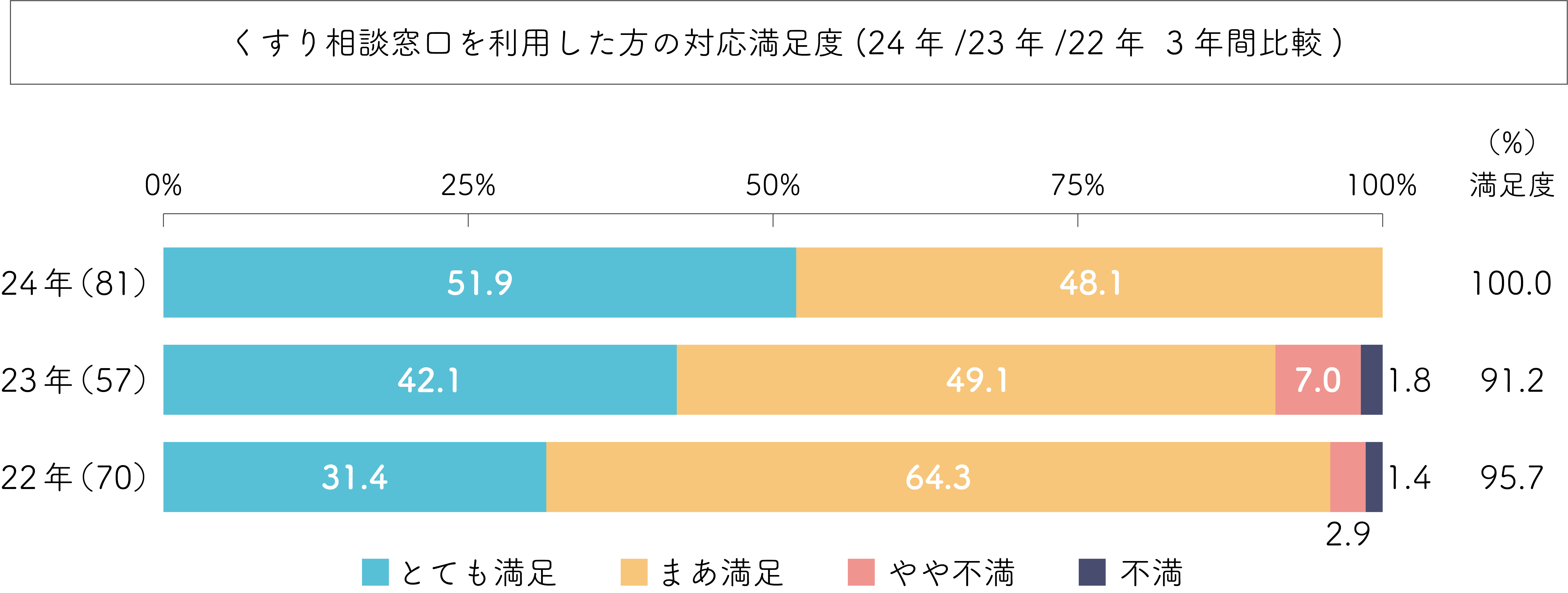 2024年に製薬協が実施したインターネット調査(※1)の結果では、くすり相談窓口を利用者された方の100%が、対応に満足(※2)していました。