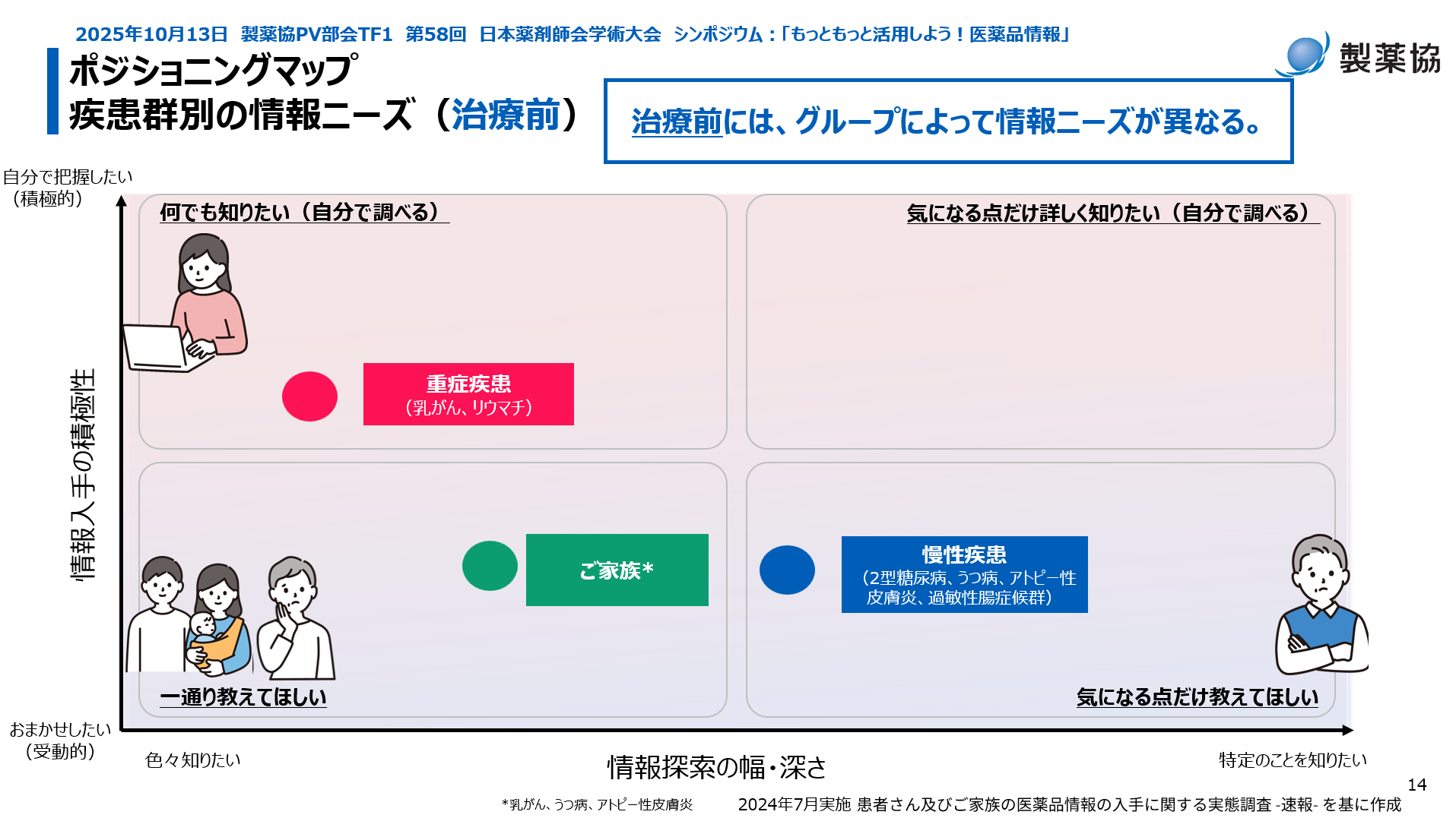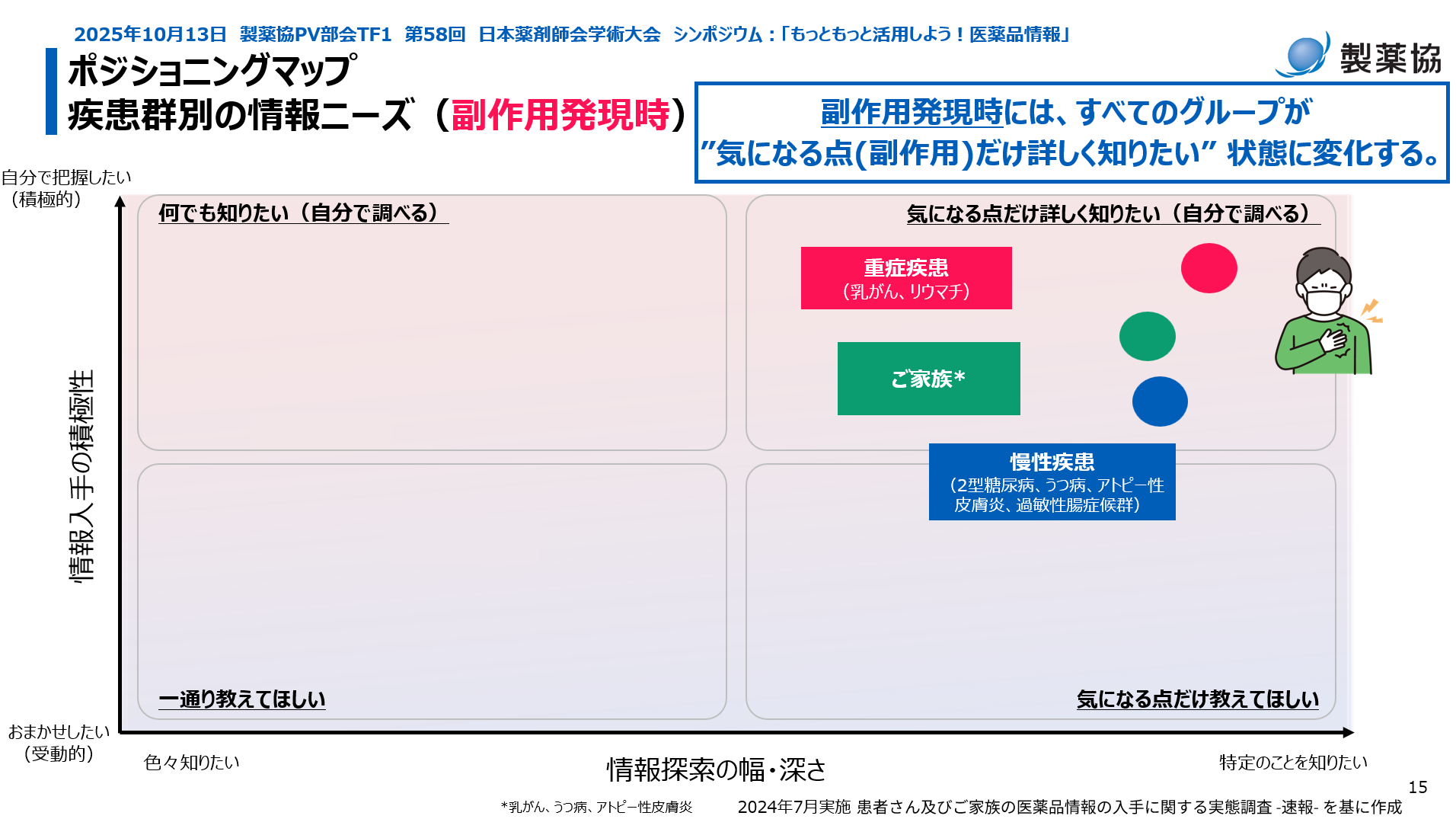 こうした中で、「医療関係者が最新で正確な情報」を収集し患者さんにあわせた情報を提供するとともに、「患者さん自身が適切な情報へアクセスできる環境」の確立が急務となっている。そのためには、患者さんの声を聞いたうえで、行政・医療関係者・企業等関連するステークホルダーの連携強化が重要である。本シンポジウムでは、「患者さんの疾患特性や治療ステージによる情報ニーズの違い」ならびに「患者団体との協働によるRMP資材の作成事例」などを提示したうえで、①資材そのものをより使いやすくするための課題、②薬剤師が服薬指導をする上での課題について、一緒に議論した。