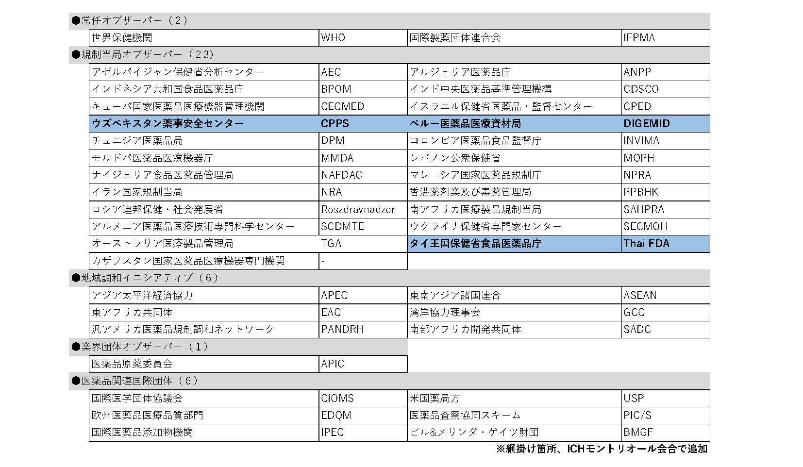 この結果、ICHメンバーは23団体(増減無)、オブザーバーは38団体(3増)となり、ICH全体としては61団体の組織体制となりました(末尾の参考資料参照)。