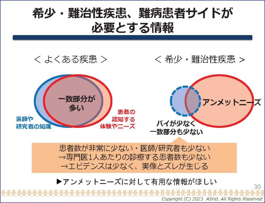 では、患者サイドがどんな情報を必要としているかについてお話しします。それは希少・難治性疾患の患者さんの体験やニーズに関する情報です。よくある疾患、たとえばインフルエンザの場合、患者さんの体験と医者の知識はほぼ一致しています。しかし、希少・難治性疾患では医者や研究者の知識が少なく、患者さんの体験とはズレがあります(図3)。