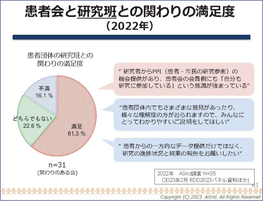 まず、研究班との関わりについてです。2012年から実施している患者団体へのアンケートによると、協力する患者会は増えてきていますが、一方的なデータ提供のみで結果のフィードバックが少ないことに対する不満もあります。関わりが満足と回答した団体は6割程度です。
