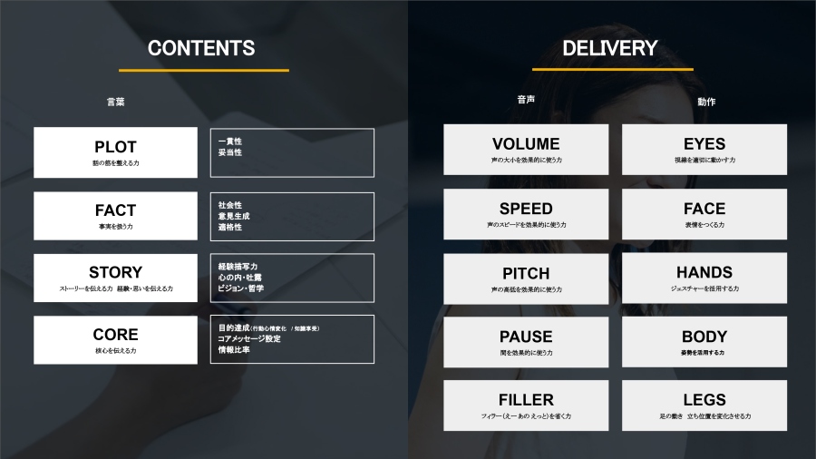 私たちは話し方を、コンテンツ(何を話すか) と デリバリー(どう表現するか) の二つに分けて考えています。コンテンツは言葉そのものに関わる要素で、デリバリーは声や動作など“伝え方”に関わる部分です。話す力を伸ばすためには、この二つをどちらも高めていく必要があります。