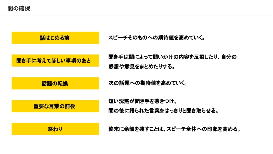 「〜について考えたことはありますか?」など問いかけをしたあとには、聞き手が内容を反芻できるように間をつくります。