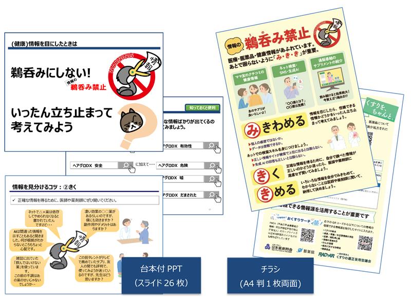 資材は、一般の方にご覧いただけるほか、薬剤師や消費者教育などに携わる方が市民講座などでご利用いただくことを想定し、パワーポイント形式となっています。聴講者の方にも参加いただける演習を含めており、パワーポイントのノート部分には、各スライドの要旨とモデル台本を付けて活用しやすいものとしています。